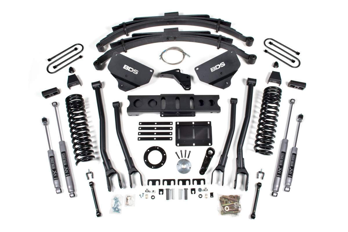 The BDS Suspension 8-inch lift kit with 4-Link conversion is engineered specifically for 2013–2018 Ram 3500 diesel-powered 4WD trucks. This kit is designed to improve stance, performance, and capability, providing clearance for up to 40-inch tires. Up front, the kit includes diesel-specific Pro-Ride coil springs, a 4-Link control arm conversion with mounting hardware, a forged drop pitman arm, a track bar bracket for steering correction, sway bar links, bump stops, stainless steel brake lines, and precision-tuned nitrogen-charged shocks. A transfer case indexing ring and new transmission crossmember are supplied to allow use of the factory front driveshaft at this lift height. In the rear, the kit uses either a block and add-a-leaf combination or optional full replacement BDS GlideRide leaf springs, along with new U-bolts, brake line brackets, and a matching set of shocks.
