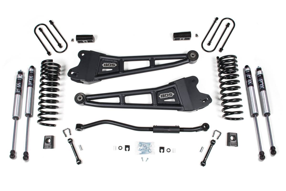 This 3-inch radius arm lift kit from BDS Suspension is designed for 2013–2018 RAM 3500 diesel-powered 4WD trucks. The kit improves stance, performance, and capability while providing clearance for up to 35-inch tires. Up front, the kit includes diesel-specific Pro-Ride coil springs, heavy duty replacement radius arms, a high-strength 1-3/8-inch solid steel adjustable track bar for steering correction, sway bar links, and brake line brackets. In the rear, the kit utilizes a high-strength fabricated lift block and longer U-bolts. Shocks are included front and rear and are available in multiple configurations.