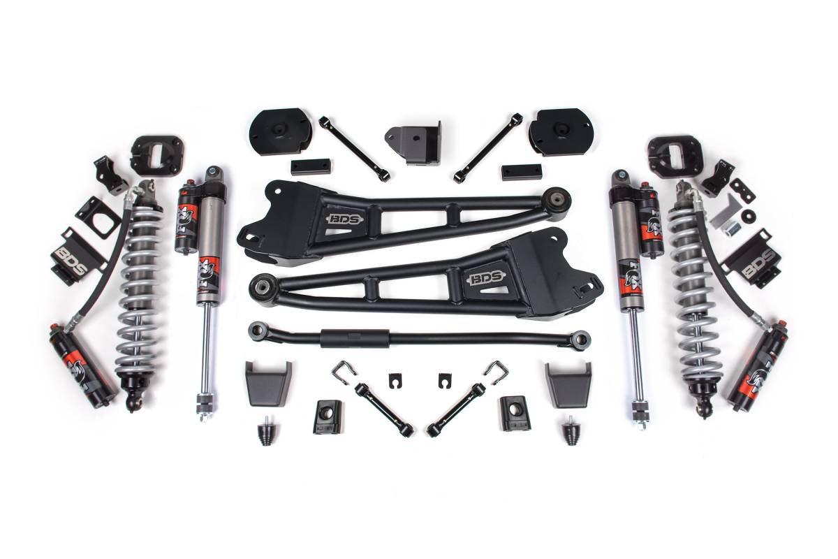 The BDS 3" Radius Arm Lift Kit for Ram 2500 trucks replaces the factory suspension setup with heavy-duty components designed for demanding on- and off-road use. Heavy-duty BDS radius arms improve articulation and provide rugged strength, while the BDS Coilover Conversion Kit fitted with FOX 2.5 Performance Elite coilovers delivers precise damping and improved ride quality. Out back, FOX 2.5 Performance Elite shocks maintain control across varied terrain. An optional FOX 2.0 hydraulic bump stop for the front is available for additional impact absorption during high-speed or heavy-impact off-road use.