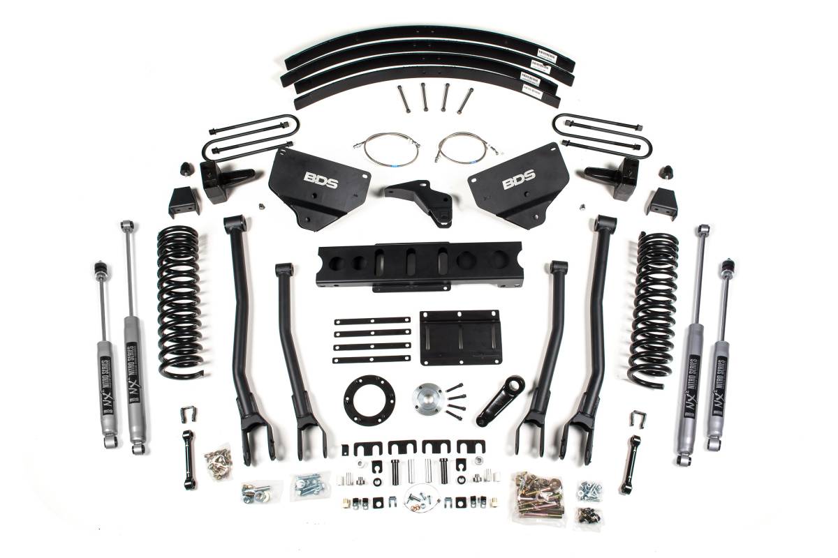 The BDS Suspension 8-inch lift kit with 4-Link conversion is engineered specifically for 2013–2018 Ram 3500 diesel-powered 4WD trucks. This kit is designed to improve stance, performance, and capability, providing clearance for up to 40-inch tires. Up front, the kit includes diesel-specific Pro-Ride coil springs, a 4-Link control arm conversion with mounting hardware, a forged drop pitman arm, a track bar bracket for steering correction, sway bar links, bump stops, stainless steel brake lines, and precision-tuned nitrogen-charged shocks. A transfer case indexing ring and new transmission crossmember are supplied to allow use of the factory front driveshaft at this lift height. In the rear, the kit uses either a block and add-a-leaf combination or optional full replacement BDS GlideRide leaf springs, along with new U-bolts, brake line brackets, and a matching set of shocks.