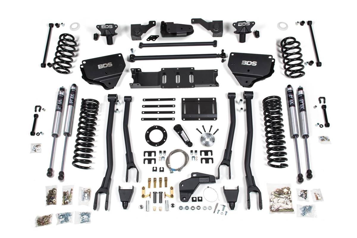 The BDS Suspension 8-inch lift kit with 4-Link conversion is engineered for the 2014–2018 RAM 2500 diesel-powered truck. Designed to improve stance, performance, and capability, this kit includes everything necessary to set your truck up with clearance for up to 40-inch tires. Up front, the kit includes diesel-specific Pro-Ride coil springs, 4-Link control arms with conversion mounts, a forged drop pitman arm, track bar bracket for steering correction, bump stops, brake line brackets, and precision-tuned shocks. A transfer case indexing ring and new transmission crossmember are supplied to allow use of the factory front driveshaft at this lift height.