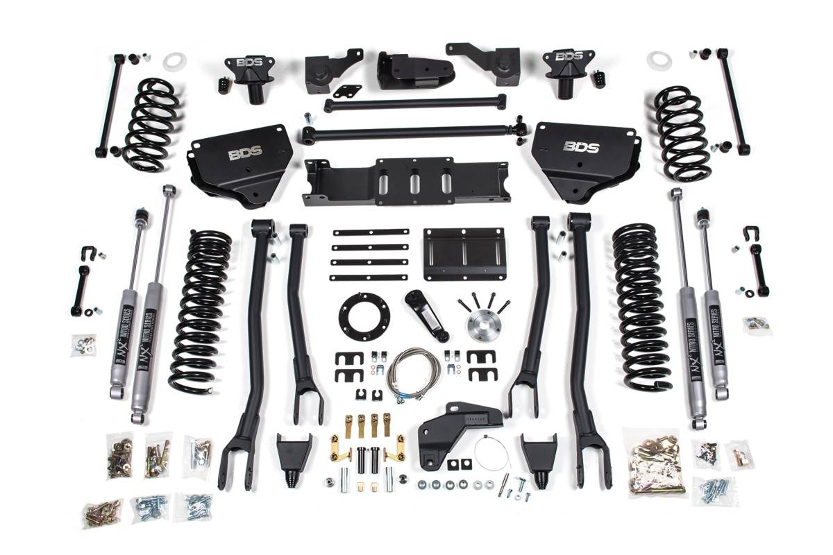 The BDS Suspension 8-inch lift kit with 4-Link conversion is engineered for the 2014–2018 RAM 2500 diesel-powered truck. Designed to improve stance, performance, and capability, this kit includes everything necessary to set your truck up with clearance for up to 40-inch tires. Up front, the kit includes diesel-specific Pro-Ride coil springs, 4-Link control arms with conversion mounts, a forged drop pitman arm, track bar bracket for steering correction, bump stops, brake line brackets, and precision-tuned shocks. A transfer case indexing ring and new transmission crossmember are supplied to allow use of the factory front driveshaft at this lift height.