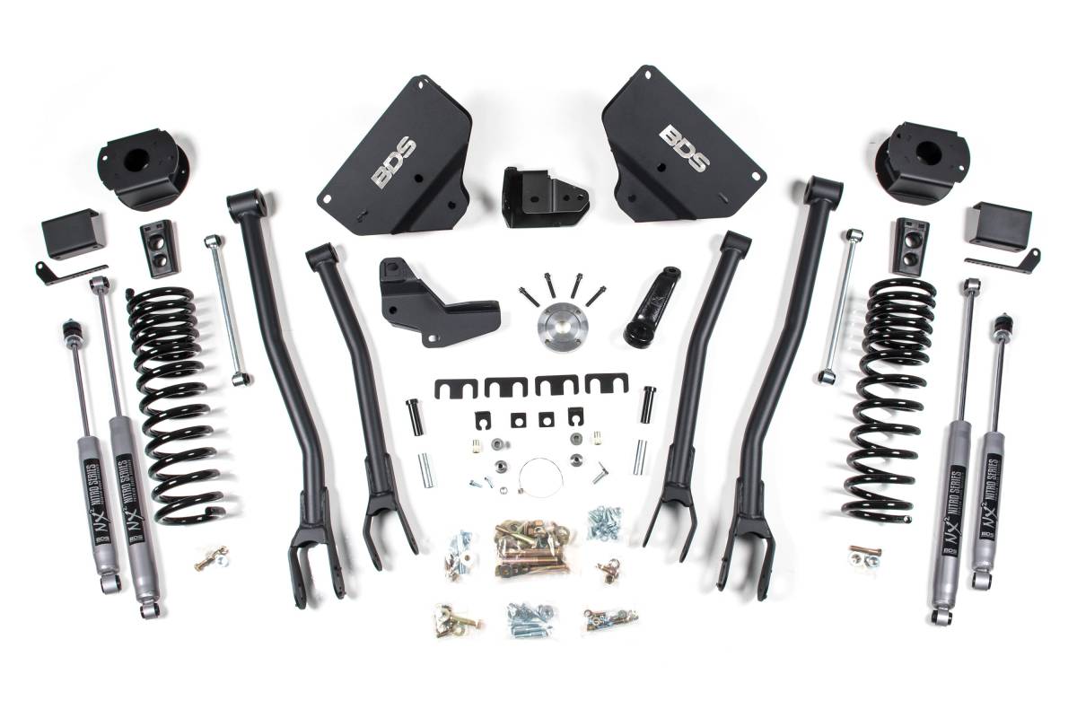 BDS Suspension engineered this 4-inch lift kit with 4-Link conversion for 2014–2018 RAM 2500 gas-powered trucks equipped with the factory rear air ride option. Designed to improve stance, performance, and capability, the kit includes everything necessary to set the truck up with clearance for up to 35-inch tires.