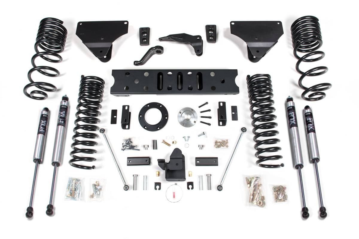This 4-inch lift kit from BDS Suspension is designed for 2014–2018 Ram 2500 Power Wagon 4WD trucks, improving stance, performance, and capability while providing clearance for tires up to 37 inches. Up front, the kit includes Pro-Ride coil springs, heavy-duty radius arm drop brackets, a forged drop pitman arm, a track bar bracket for steering correction, sway bar relocation hardware, and brake line brackets. A transfer case indexing ring and new transmission crossmember are supplied to allow use of the factory front driveshaft at this lift height. In the rear, the kit uses progressive rate Pro-Ride coil springs, a track bar relocation bracket, bump stop extensions, sway bar links, and a matched set of shocks. High-strength tubular radius arms replace the factory stamped steel units, offering caster adjustment and an OE-style rubber bushing at the frame mount for smooth, quiet, service-free operation.