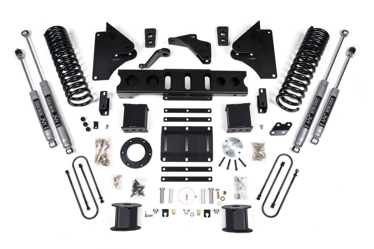 This 5.5-inch lift kit from BDS Suspension is designed for 2013–2018 RAM 3500 gas-powered trucks equipped with factory rear air ride. The kit improves stance, performance, and capability while providing clearance for up to 37-inch tires. Up front, the kit includes gas-specific Pro-Ride coil springs, radius arm drop brackets, a forged drop pitman arm, a track bar bracket for steering correction, bump stops, brake line brackets, and precision-tuned nitrogen-charged shocks. In the rear, the kit utilizes a high-strength fabricated lift block, heavy duty air bag spacers, longer u-bolts, and a matched set of shocks.
