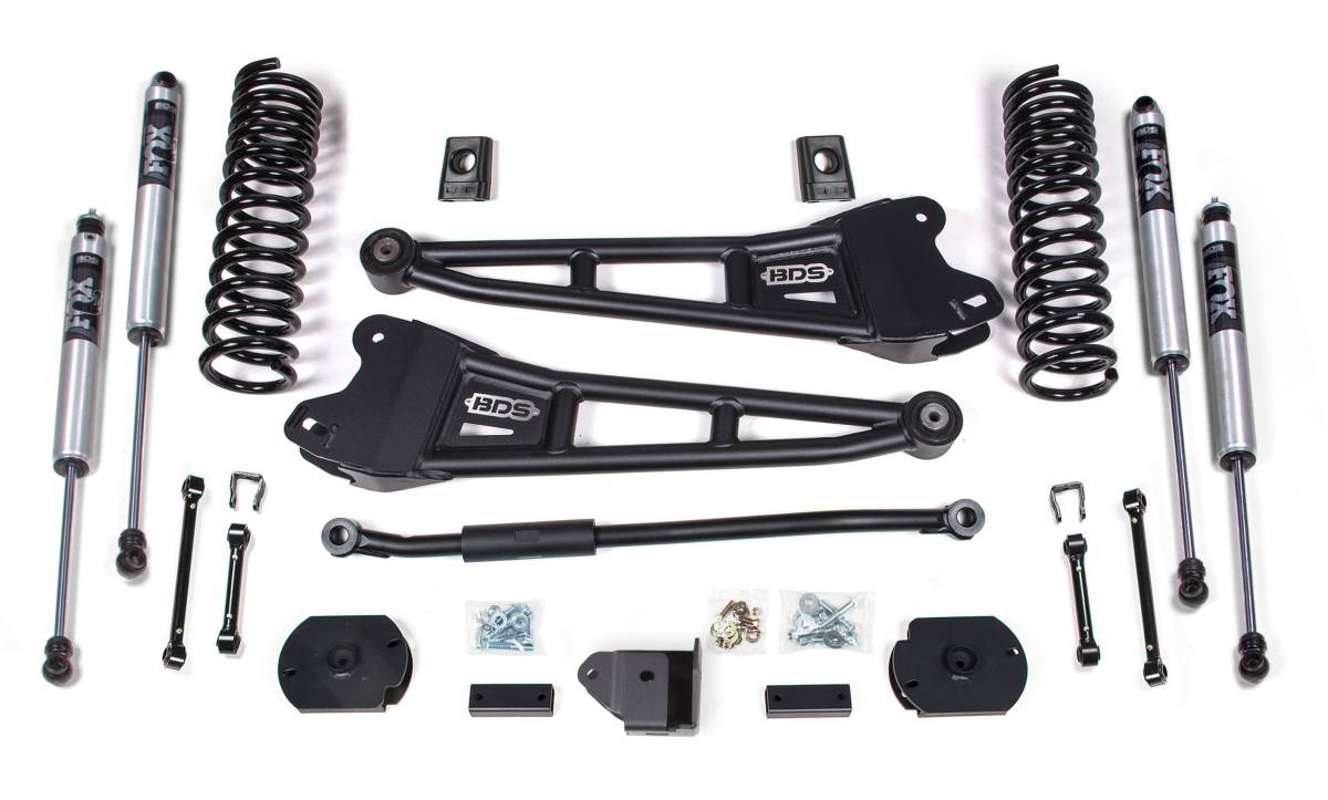 This 3-inch radius arm lift kit from BDS Suspension is designed for diesel-powered Ram 2500 4WD trucks (2019–2024), improving stance, performance, and capability while providing clearance for up to 35-inch tires. Up front, the kit includes diesel-specific Pro-Ride coil springs, heavy duty replacement radius arms, a high-strength 1-3/8-inch solid steel adjustable track bar for steering correction, sway bar links, brake line brackets, and precision-tuned shocks. In the rear, the kit utilizes a high-strength fabricated coil spacer, track bar relocation bracket, bump stops, and a matching set of shocks.