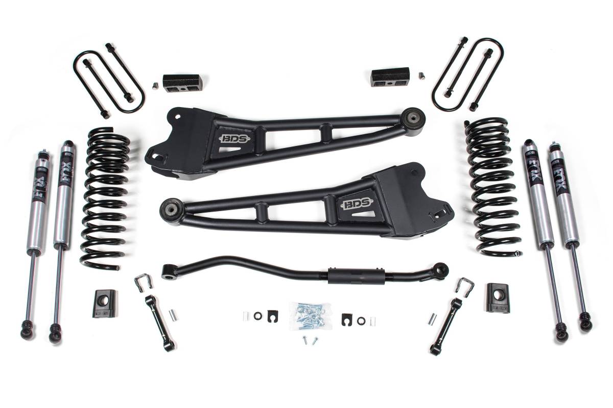 This 3-inch radius arm lift kit from BDS Suspension is designed for 2019–2024 Ram 3500 diesel-powered 4WD trucks. The kit improves stance, performance, and capability while providing clearance for tires up to 35 inches. Up front, the kit includes diesel-specific Pro-Ride coil springs, heavy duty replacement radius arms, a high-strength 1-3/8-inch solid steel adjustable track bar for steering correction, sway bar links, brake line brackets, and precision-tuned nitrogen charged shocks. In the rear, the kit utilizes a high-strength fabricated lift block, longer u-bolts, and a matched set of rear shocks. Select the rear box kit based on whether your Ram 3500 is equipped with the factory rear overload leaf spring, and choose your preferred shock option at the time of purchase.