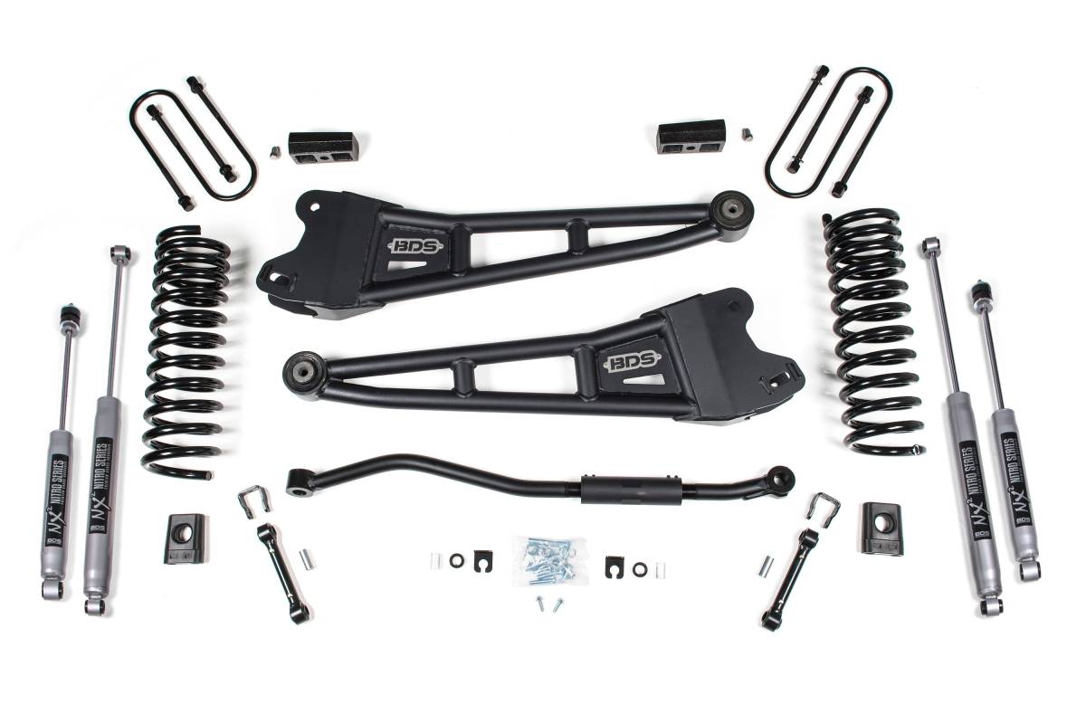 This 3-inch radius arm lift kit from BDS Suspension is designed for 2019–2024 Ram 3500 diesel-powered 4WD trucks. The kit improves stance, performance, and capability while providing clearance for tires up to 35 inches. Up front, the kit includes diesel-specific Pro-Ride coil springs, heavy duty replacement radius arms, a high-strength 1-3/8-inch solid steel adjustable track bar for steering correction, sway bar links, brake line brackets, and precision-tuned nitrogen charged shocks. In the rear, the kit utilizes a high-strength fabricated lift block, longer u-bolts, and a matched set of rear shocks. Select the rear box kit based on whether your Ram 3500 is equipped with the factory rear overload leaf spring, and choose your preferred shock option at the time of purchase.