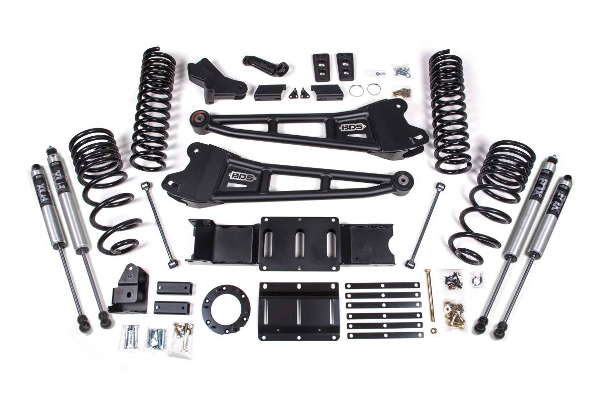 This 4-inch radius arm lift kit from BDS Suspension is designed for 2019–2024 Ram 2500 4WD diesel trucks. The kit improves stance, performance, and capability, providing clearance for up to 35-inch tires. Up front, the kit includes diesel-specific Pro-Ride coil springs, heavy-duty replacement radius arms, a forged drop pitman arm, a track bar bracket for steering correction, sway bar relocation, brake line brackets, and precision-tuned shocks. A transfer case indexing ring and new transmission crossmember are included to allow use of the factory front driveshaft at this lift height. In the rear, the kit utilizes progressive rate Pro-Ride coil springs, a track bar relocation bracket, bump stop extensions, sway bar links, and a matching set of shocks.