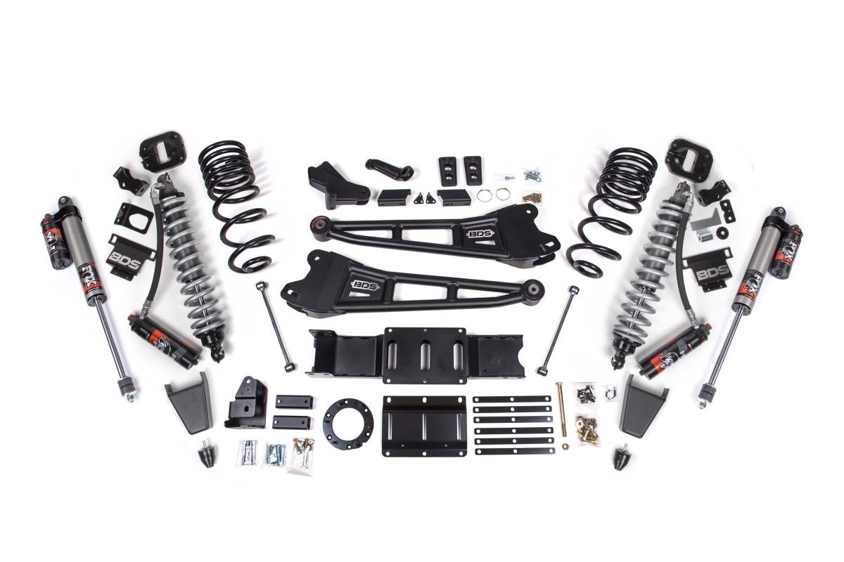 The BDS 4" Radius Arm Lift Kit for RAM 2500 trucks replaces the stock suspension setup with heavy-duty components designed for improved articulation, strength, and on- and off-road capability. The kit centers on a BDS Coilover Conversion with FOX 2.5 Performance Elite coilovers up front and FOX 2.5 Performance Elite shocks out back. Heavy-duty radius arms correct caster geometry and maximize ground clearance, while a front adjustable track bar and sway bar correction hardware maintain proper alignment and handling after the lift is installed.