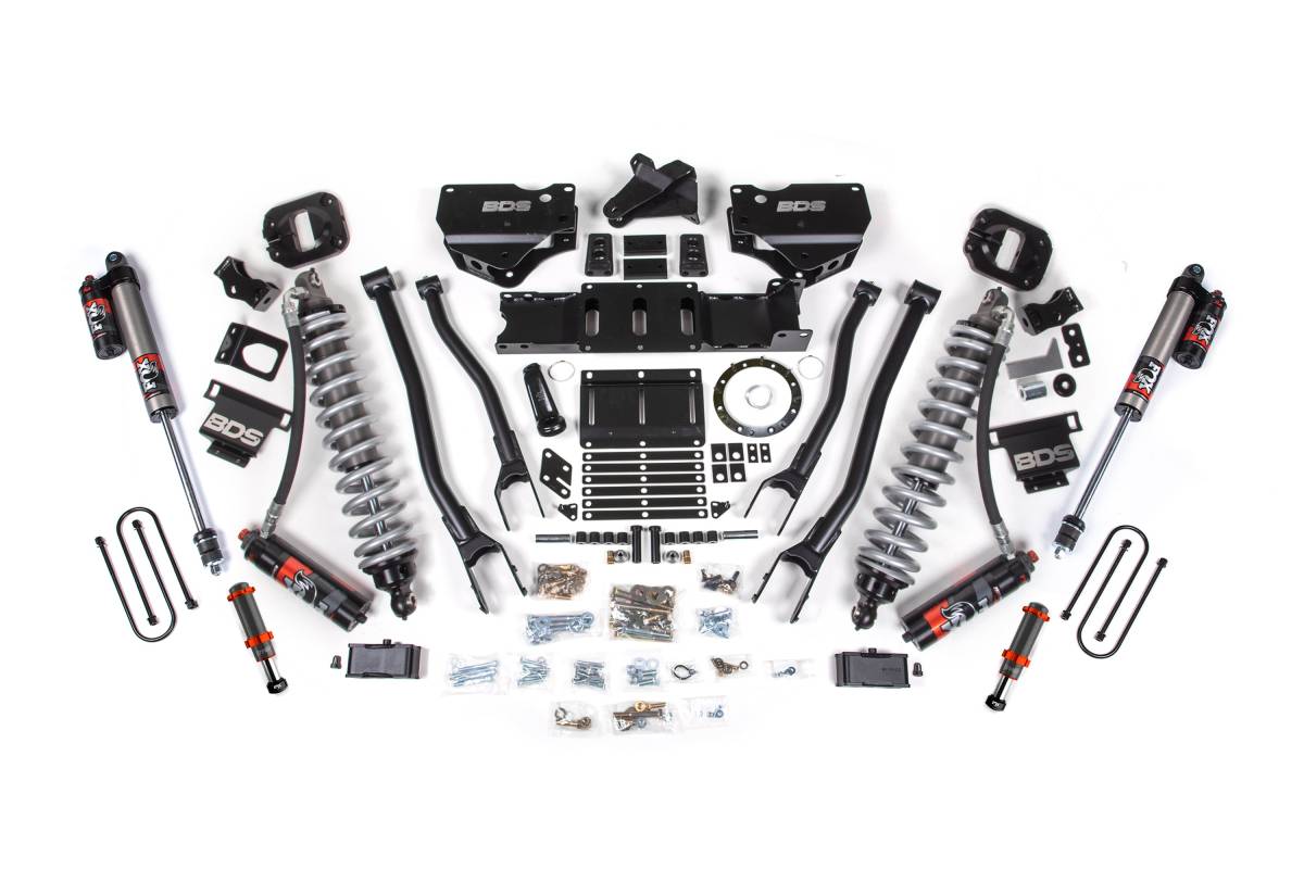 The BDS 4-inch 4-Link Lift Kit for the Ram 3500 (2019–2024) 4WD Diesel replaces the factory suspension setup with heavy-duty components designed for serious off-road performance and durability. The kit features BDS heavy-duty 4-Link arms for improved articulation and strength, paired with a front coilover conversion using FOX 2.5 Performance Elite coilovers for enhanced control and damping. FOX Performance Elite rear shocks provide consistent performance in the rear. An optional FOX 2.0 hydraulic bump stop upgrade is available for the front to add an additional layer of control under hard impacts and at full suspension travel.