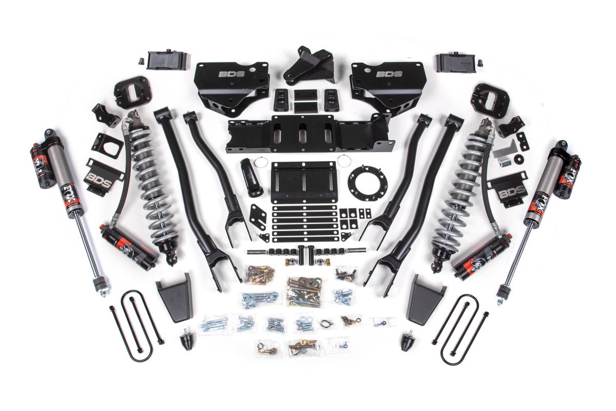 The BDS 4-inch 4-Link Lift Kit for the Ram 3500 (2019–2024) 4WD Diesel replaces the factory suspension setup with heavy-duty components designed for serious off-road performance and durability. The kit features BDS heavy-duty 4-Link arms for improved articulation and strength, paired with a front coilover conversion using FOX 2.5 Performance Elite coilovers for enhanced control and damping. FOX Performance Elite rear shocks provide consistent performance in the rear. An optional FOX 2.0 hydraulic bump stop upgrade is available for the front to add an additional layer of control under hard impacts and at full suspension travel.