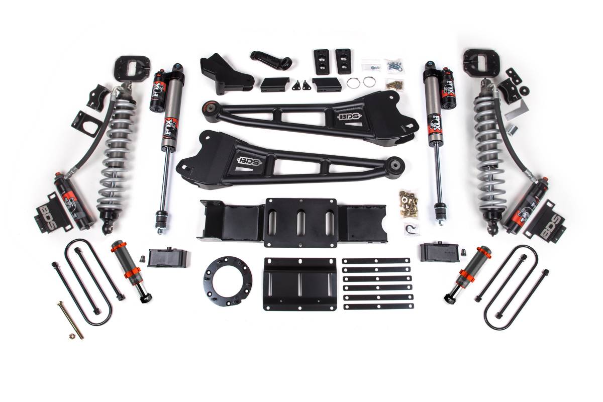 The BDS 6-Inch Radius Arm Lift Kit for 2019–2024 Ram 3500 4WD Diesel trucks replaces the factory suspension with heavy-duty components engineered for strength and articulation. Heavy-duty BDS radius arms replace the stock setup up front, while the BDS Coilover Conversion Kit mounts FOX 2.5 Performance Elite coilovers in the factory coil spring bucket for improved damping and ride quality on and off the road. FOX Performance Elite shocks are fitted in the rear. An optional FOX 2.0 Hydraulic Bump Stop is available for additional front-end impact absorption at full suspension travel.