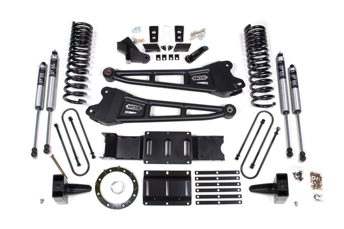 This 6-inch radius arm lift kit from BDS Suspension is designed for 2019–2024 Ram 3500 diesel-powered 4WD trucks. The kit improves stance, performance, and capability while providing clearance for up to 37-inch tires. Up front, it includes diesel-specific Pro-Ride coil springs, heavy-duty replacement radius arms, a forged drop pitman arm, a track bar bracket for steering correction, sway bar relocation, and brake line brackets. A transfer case indexing ring and new HD transmission crossmember are included to correct front driveline angles and allow use of the factory front driveshaft. In the rear, the kit uses a high-strength steel lift block, longer U-bolts, and a matched set of shocks.