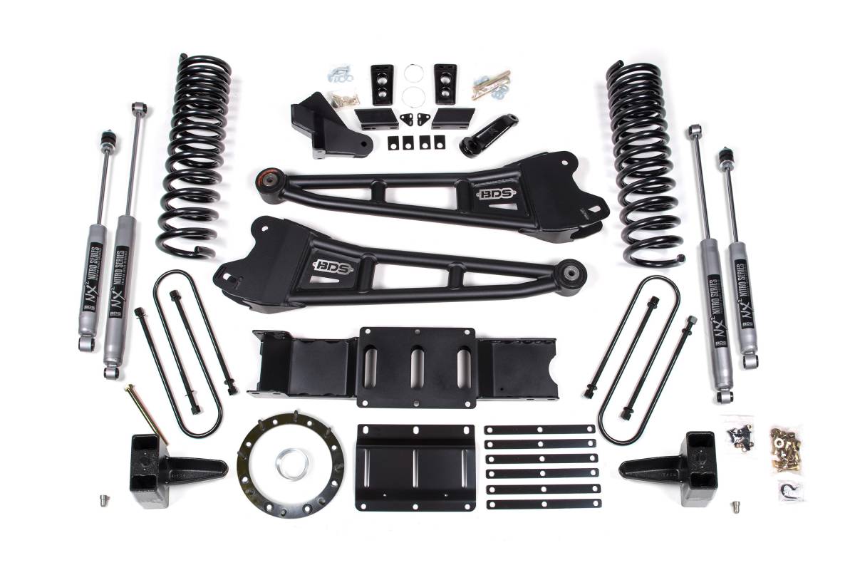 This 6-inch radius arm lift kit from BDS Suspension is designed for 2019–2024 Ram 3500 diesel-powered 4WD trucks. The kit improves stance, performance, and capability while providing clearance for up to 37-inch tires. Up front, it includes diesel-specific Pro-Ride coil springs, heavy-duty replacement radius arms, a forged drop pitman arm, a track bar bracket for steering correction, sway bar relocation, and brake line brackets. A transfer case indexing ring and new HD transmission crossmember are included to correct front driveline angles and allow use of the factory front driveshaft. In the rear, the kit uses a high-strength steel lift block, longer U-bolts, and a matched set of shocks.