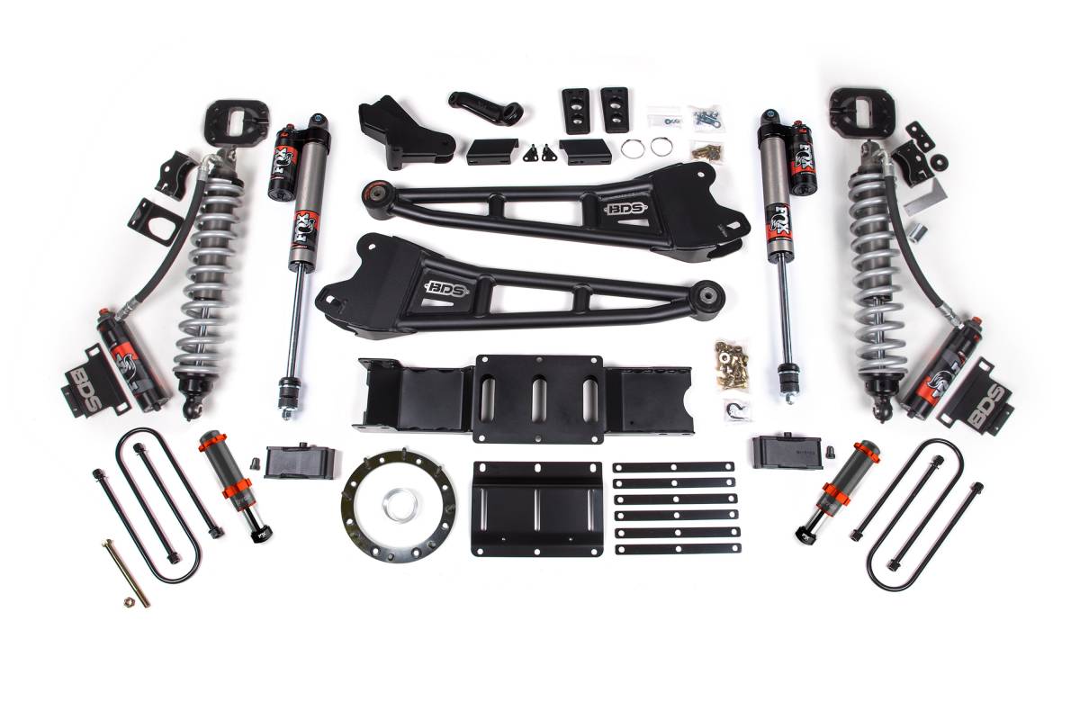 The BDS 6-Inch Radius Arm Lift Kit for 2019–2024 Ram 3500 4WD Diesel trucks replaces the factory suspension with heavy-duty components engineered for strength and articulation. Heavy-duty BDS radius arms replace the stock setup up front, while the BDS Coilover Conversion Kit mounts FOX 2.5 Performance Elite coilovers in the factory coil spring bucket for improved damping and ride quality on and off the road. FOX Performance Elite shocks are fitted in the rear. An optional FOX 2.0 Hydraulic Bump Stop is available for additional front-end impact absorption at full suspension travel.