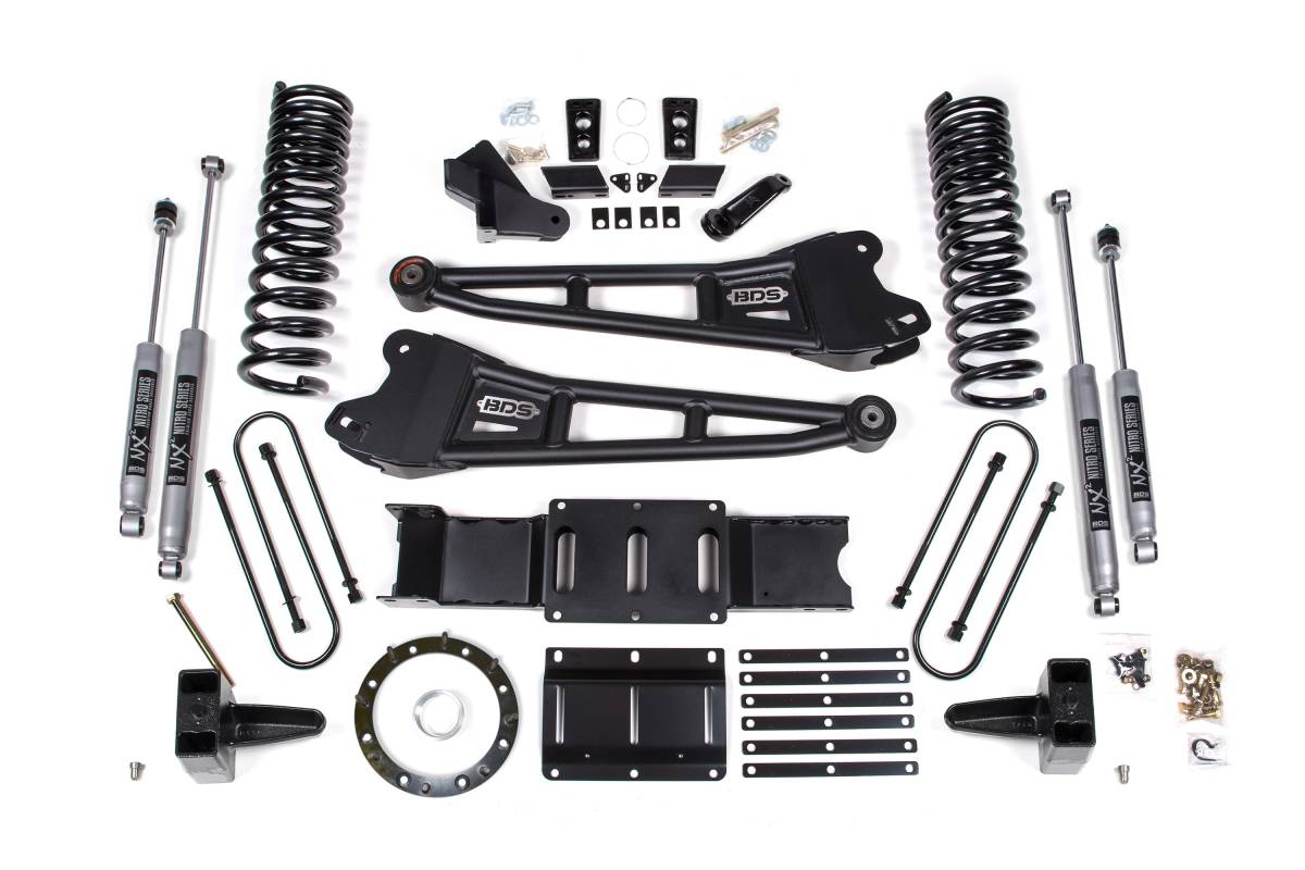 This 5.5-inch radius arm lift kit from BDS Suspension is designed for 2019–2024 Ram 3500 4WD gas-powered trucks. The kit improves stance, performance, and capability while providing clearance for up to 37-inch tires. Up front, the kit includes gas-specific Pro-Ride coil springs, heavy-duty replacement radius arms, a forged drop pitman arm, a track bar bracket for steering correction, sway bar relocation, brake line brackets, and precision-tuned nitrogen-charged shocks. A transfer case indexing ring and new transmission crossmember are included to allow use of the factory front driveshaft at this lift height. In the rear, the kit uses a high-strength fabricated lift block, longer U-bolts, and a matching set of shocks.