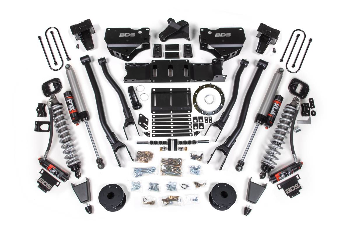The BDS 6-Inch 4-Link Lift Kit for 2019–2024 RAM 3500 4WD Diesel trucks replaces the stock suspension with heavy-duty hardware built for serious off-road and on-road performance. The kit features heavy-duty BDS 4-Link arms for improved articulation and ground clearance, paired with a BDS Coilover Conversion Kit running FOX 2.5 Performance Elite coilovers up front for precise damping and control. FOX 2.5 Performance Elite shocks are included for the rear. An optional FOX 2.0 Hydraulic Bump Stop upgrade is available for the front to manage big impacts at full suspension travel.