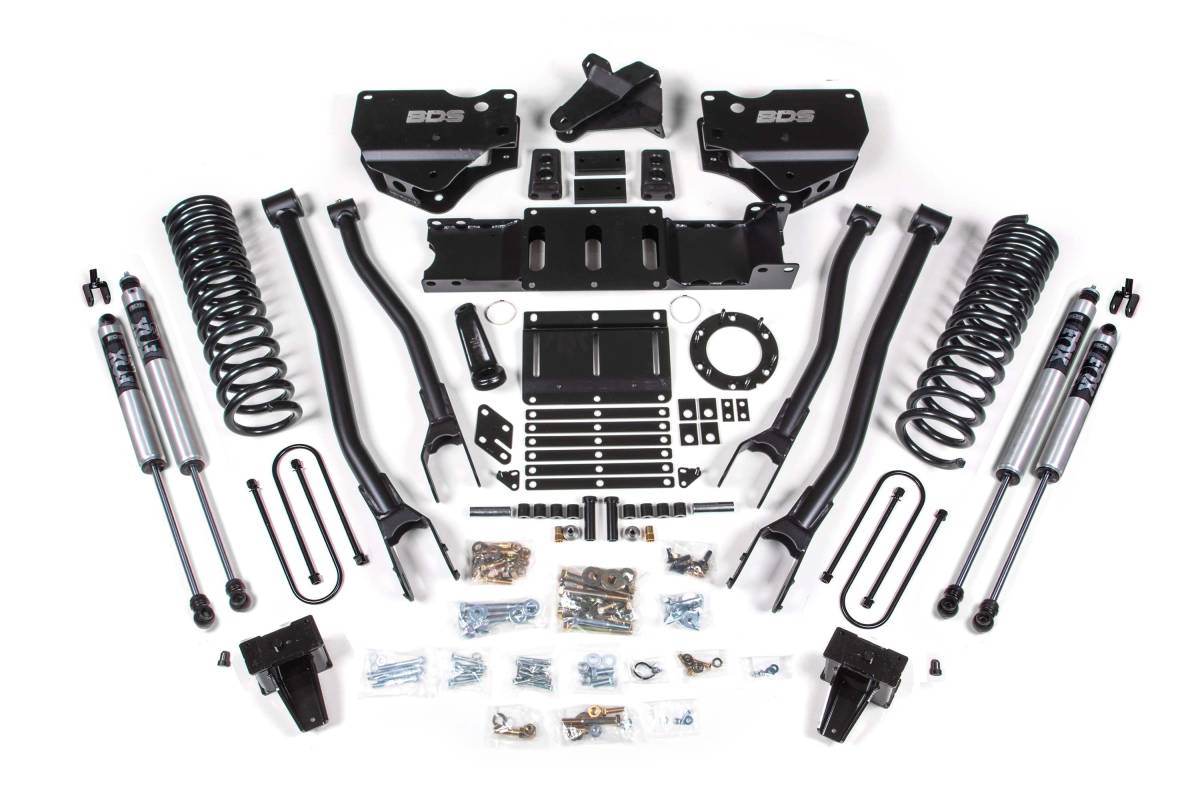 This 5.5-inch lift kit with 4-Link conversion from BDS Suspension is designed for 2019–2024 Ram 3500 4WD gas-powered trucks. The kit improves stance, performance, and capability while providing clearance for up to 37-inch tires. Up front, the kit includes gas-specific Pro-Ride coil springs, 4-Link control arms and conversion brackets, a forged drop pitman arm, track bar bracket for steering correction, sway bar relocation, brake line brackets, and precision-tuned nitrogen charged shocks. A transfer case indexing ring and new transmission crossmember are supplied to allow use of the factory front driveshaft at this lift height. In the rear, the kit utilizes a high-strength steel lift block, longer u-bolts, and a matching set of shocks.