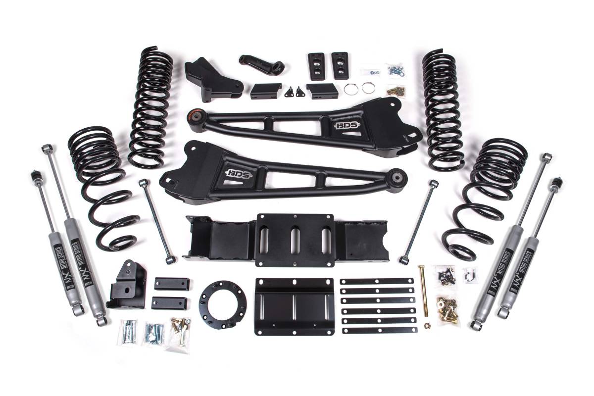 This 4-inch radius arm lift kit from BDS Suspension is designed for 2019–2026 Ram 2500 4WD gas-powered trucks. The kit provides improved stance, performance, and capability with clearance for up to 35-inch tires. Up front, the kit includes gas-specific Pro-Ride coil springs, heavy-duty tubular replacement radius arms, a forged drop pitman arm, a track bar drop bracket for steering correction, sway bar relocation hardware, and brake line brackets. A transfer case indexing ring and new HD transmission crossmember are included to allow use of the factory front driveshaft at this lift height. In the rear, progressive rate Pro-Ride coil springs, a track bar relocation bracket, bump stop extensions, sway bar links, and a matched set of shocks are supplied.