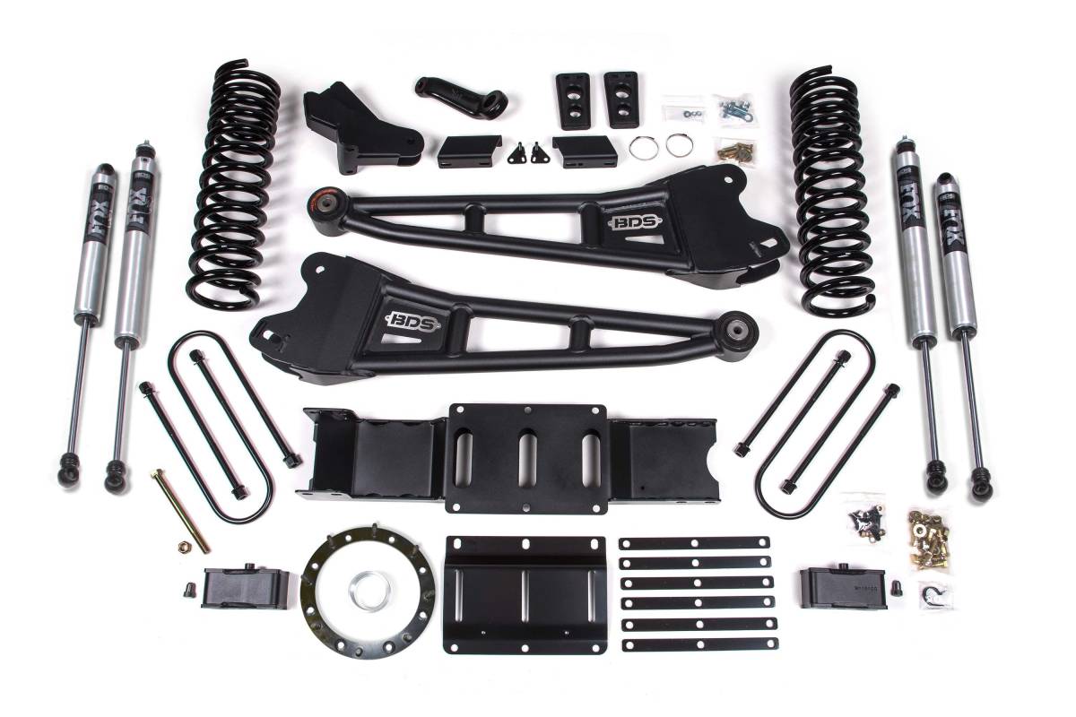 This 4-inch radius arm lift kit from BDS Suspension is designed for 2019–2024 Ram 3500 4WD gas-powered trucks. The kit provides clearance for up to 37-inch tires and includes all components necessary for a complete front and rear lift. Up front, the kit features gas-specific Pro-Ride coil springs, heavy-duty replacement radius arms, a forged drop pitman arm, track bar bracket for steering correction, sway bar relocation hardware, and brake line brackets. A transfer case indexing ring and new transmission crossmember are included to allow use of the factory front driveshaft at this lift height. In the rear, the kit uses a high-strength fabricated lift block, longer U-bolts, and a matched set of shocks. Precision-tuned NX2 Nitro Series, FOX 2.0 Performance Series, or FOX 2.5 Performance Elite shocks are available.