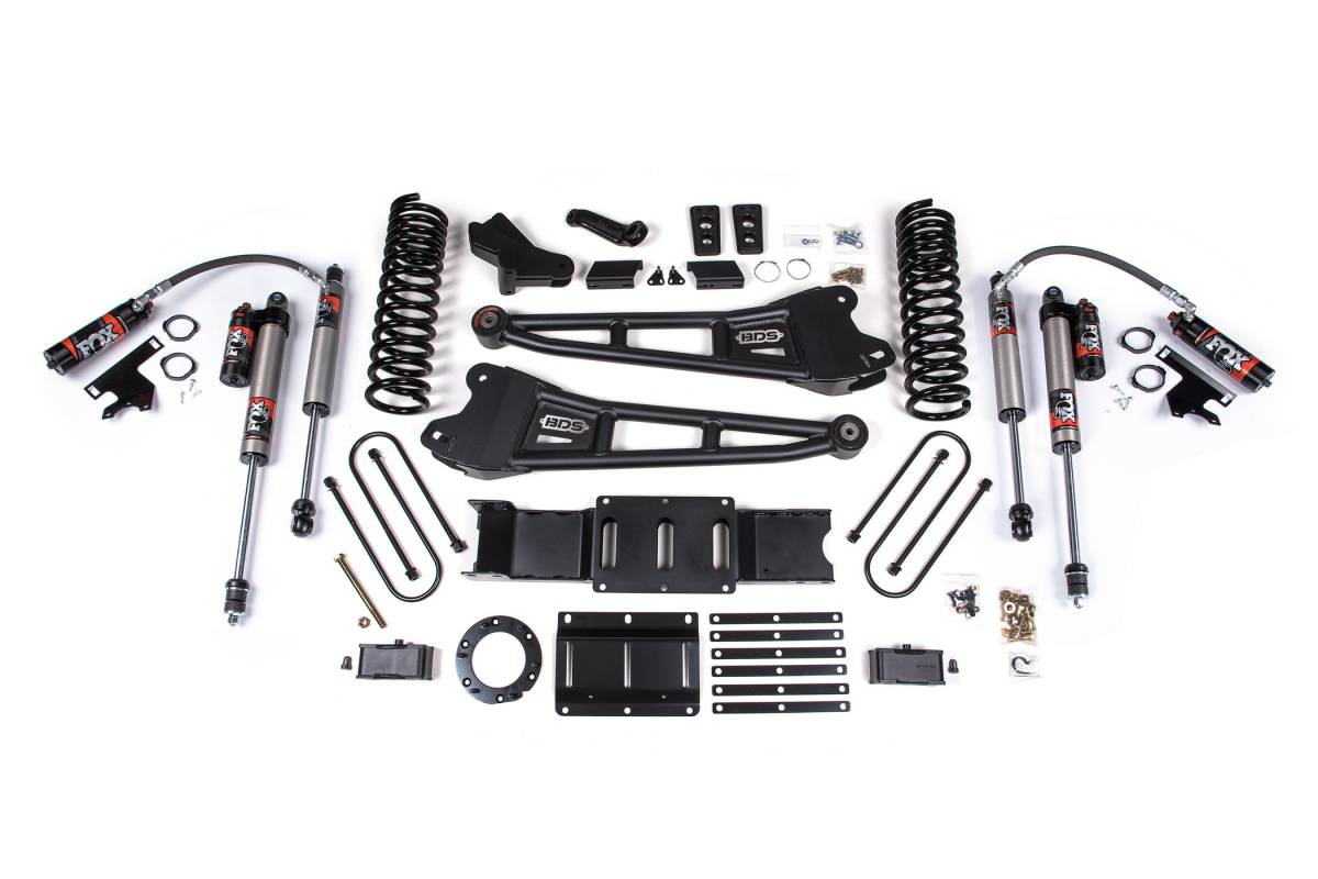 This 4-inch radius arm lift kit from BDS Suspension is designed for 2019–2024 Ram 3500 4WD gas-powered trucks. The kit provides clearance for up to 37-inch tires and includes all components necessary for a complete front and rear lift. Up front, the kit features gas-specific Pro-Ride coil springs, heavy-duty replacement radius arms, a forged drop pitman arm, track bar bracket for steering correction, sway bar relocation hardware, and brake line brackets. A transfer case indexing ring and new transmission crossmember are included to allow use of the factory front driveshaft at this lift height. In the rear, the kit uses a high-strength fabricated lift block, longer U-bolts, and a matched set of shocks. Precision-tuned NX2 Nitro Series, FOX 2.0 Performance Series, or FOX 2.5 Performance Elite shocks are available.