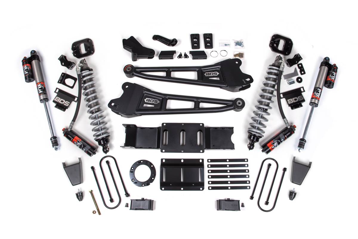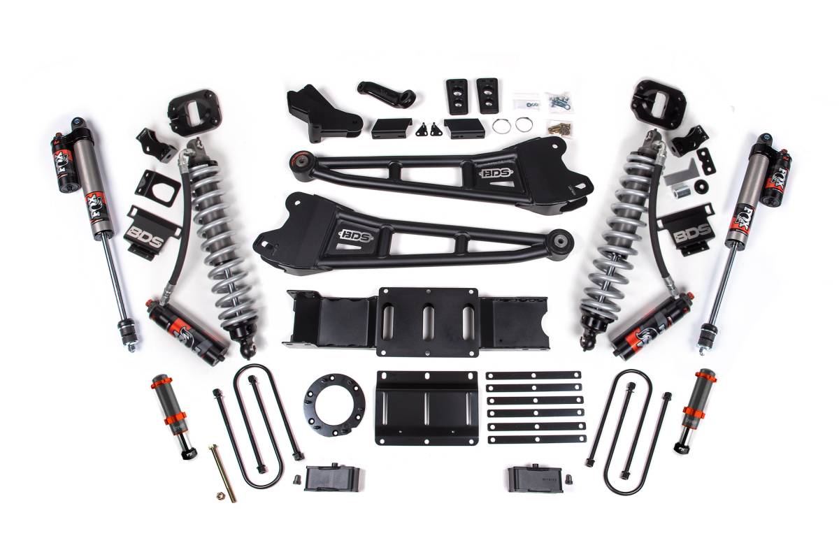 The BDS 4-Inch Radius Arm Lift Kit for 2019–2024 RAM 3500 4WD Diesel replaces the factory front suspension setup with a coilover conversion system featuring FOX 2.5 Performance Elite coilovers, delivering enhanced control, improved ride quality, and precision damping on and off the road. Heavy-duty BDS radius arms replace the stock units to improve articulation, correct caster, and maximize ground clearance. FOX Performance Elite rear shocks provide controlled, smooth performance over varied terrain. An optional FOX 2.0 hydraulic bump stop for the front is available to add an additional layer of absorption during high-impact off-road use.
