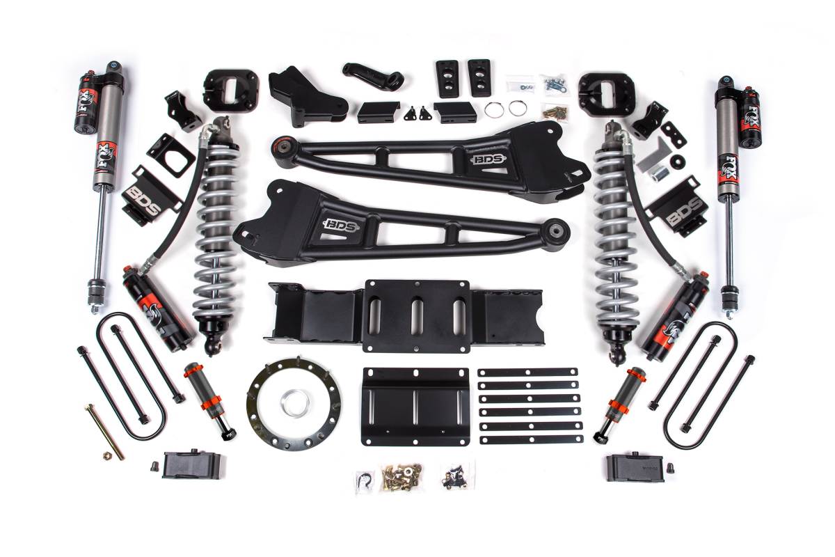 The BDS 4-Inch Radius Arm Lift Kit for 2019–2024 RAM 3500 4WD Diesel replaces the factory front suspension setup with a coilover conversion system featuring FOX 2.5 Performance Elite coilovers, delivering enhanced control, improved ride quality, and precision damping on and off the road. Heavy-duty BDS radius arms replace the stock units to improve articulation, correct caster, and maximize ground clearance. FOX Performance Elite rear shocks provide controlled, smooth performance over varied terrain. An optional FOX 2.0 hydraulic bump stop for the front is available to add an additional layer of absorption during high-impact off-road use.