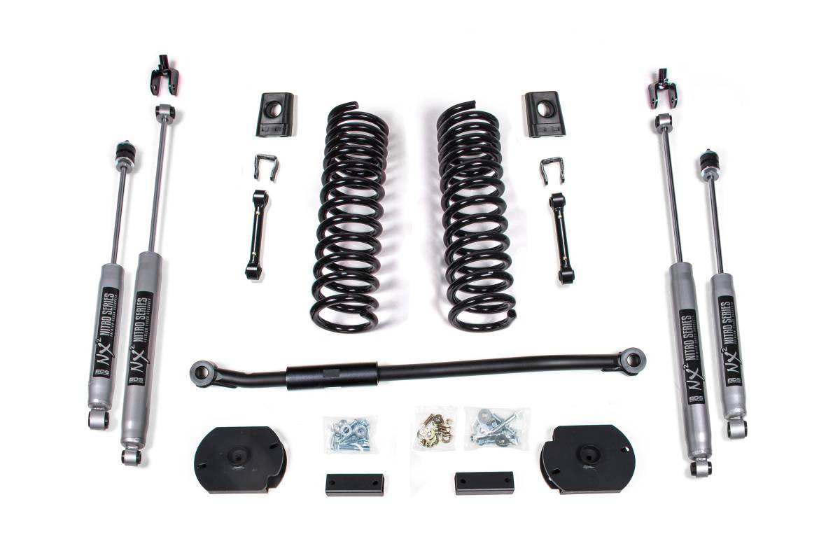 This 2-inch lift kit from BDS Suspension is designed to level out and improve the stance, performance, and capability of the RAM 2500 Power Wagon (2014–2024) 4WD. The kit includes everything necessary to set up the truck correctly, providing clearance for up to 35-inch tires. Up front, the kit features diesel-specific Pro-Ride coil springs, a high-strength 1-3/8-inch solid steel adjustable track bar for steering correction, sway bar links, and precision-tuned nitrogen-charged shocks. In the rear, the kit utilizes a high-strength fabricated coil spacer, bump stop extensions, and a matching set of shocks.