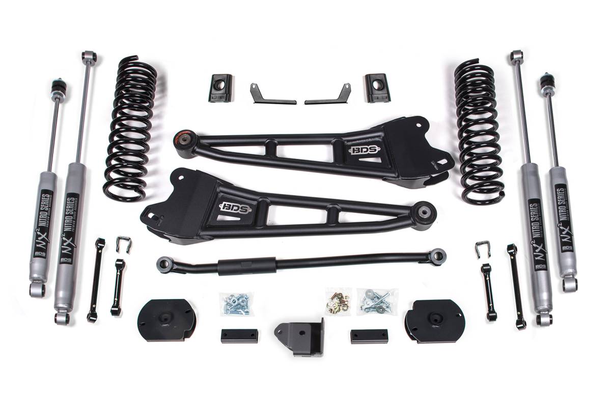 This 3-inch radius arm lift kit from BDS Suspension is designed for Ram 2500 diesel-powered trucks equipped with factory rear air ride. The kit improves stance, performance, and capability while providing clearance for up to 35-inch tires. Up front, the kit includes diesel-specific Pro-Ride coil springs, heavy duty replacement radius arms, a high-strength 1-3/8-inch solid steel adjustable track bar for steering correction, sway bar links, and brake line brackets. In the rear, the kit utilizes a high-strength fabricated coil spacer, a track bar relocation bracket to correct axle positioning, bump stop extensions, and sway bar links. Precision-tuned shocks are included front and rear in your choice of NX2 Nitro or FOX 2.0 Performance Series.