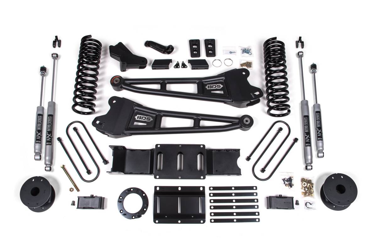 This 4-inch radius arm lift kit from BDS Suspension is designed for factory rear air bag equipped Ram 3500 diesel trucks (2019–2024) 4WD. The kit improves stance, performance, and capability while providing clearance for up to 35-inch tires. Up front, the kit includes diesel-specific Pro-Ride coil springs, heavy-duty replacement radius arms, a forged drop pitman arm, a track bar bracket for steering correction, sway bar relocation, and brake line brackets. A transfer case indexing ring and new transmission crossmember are included to allow use of the factory front driveshaft at this lift height. In the rear, the kit uses a high-strength fabricated lift block, heavy-duty air bag spacers, and longer U-bolts. All variants include precision-tuned shocks front and rear.