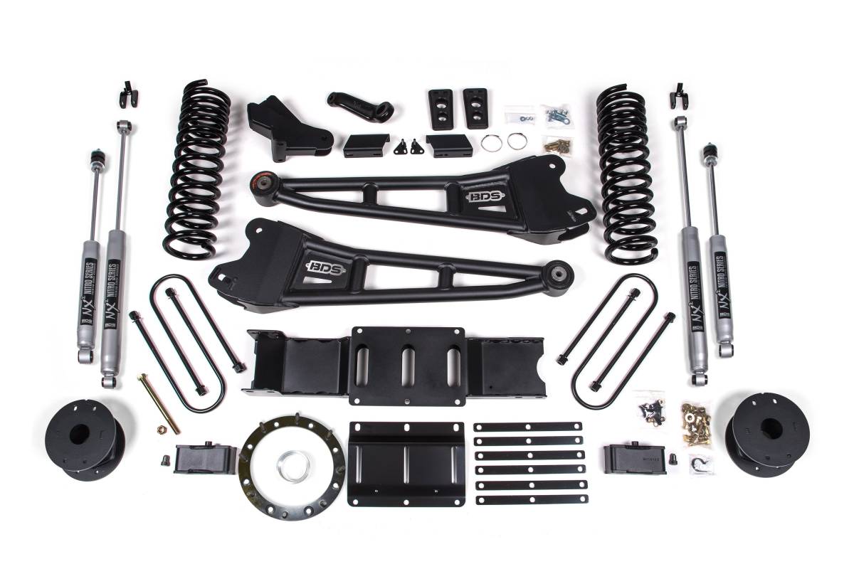 This 4-inch radius arm lift kit from BDS Suspension is designed for factory rear air bag equipped Ram 3500 gas-powered trucks (2019–2024) with 4WD. The kit improves stance, performance, and capability, providing clearance for up to 35-inch tires. Up front, the kit includes gas-specific Pro-Ride coil springs, heavy-duty tubular replacement radius arms, a forged drop pitman arm, a track bar drop bracket for steering correction, sway bar relocation hardware, brake line brackets, and precision-tuned nitrogen charged shocks. A transfer case indexing ring and new transmission crossmember are supplied to allow use of the factory front driveshaft at this lift height. In the rear, the kit utilizes a high-strength fabricated lift block, heavy-duty air bag spacers, longer U-bolts, and a matched set of shocks.