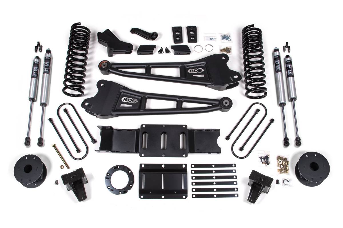 This 6-inch radius arm lift kit from BDS Suspension is engineered for diesel-powered Ram 3500 trucks equipped with factory rear air bags (2019–2024, 4WD). The kit provides clearance for up to 37-inch tires and includes all components needed to properly lift and correct the geometry of your truck. Up front, the kit features diesel-specific Pro-Ride coil springs, heavy-duty tubular radius arms, a forged drop pitman arm, a track bar bracket for steering correction, sway bar relocation hardware, brake line brackets, and precision-tuned shocks. A transfer case indexing ring and new transmission crossmember are included to allow continued use of the factory front driveshaft at this lift height. In the rear, the kit uses a high-strength steel lift block, a heavy-duty air bag spacer, longer U-bolts, and a matched set of shocks.