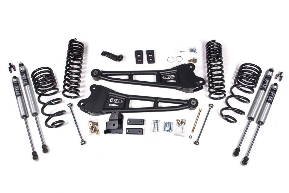 This 4-inch radius arm lift kit from BDS Suspension is engineered for 2014–2018 RAM 2500 diesel-powered 4WD trucks. The kit is designed to improve stance, performance, and capability, providing clearance for up to 35-inch tires. Up front, the kit includes diesel-specific Pro-Ride coil springs, heavy-duty replacement radius arms, a forged drop pitman arm, a track bar bracket for steering correction, sway bar relocation, and brake line brackets. Out back, the kit utilizes progressive rate Pro-Ride coil springs, a track bar relocation bracket, bump stop extensions, and sway bar links. Shocks are available in NX2 Nitro Series, FOX 2.0 Performance Series, or FOX 2.5 Performance Elite configurations.