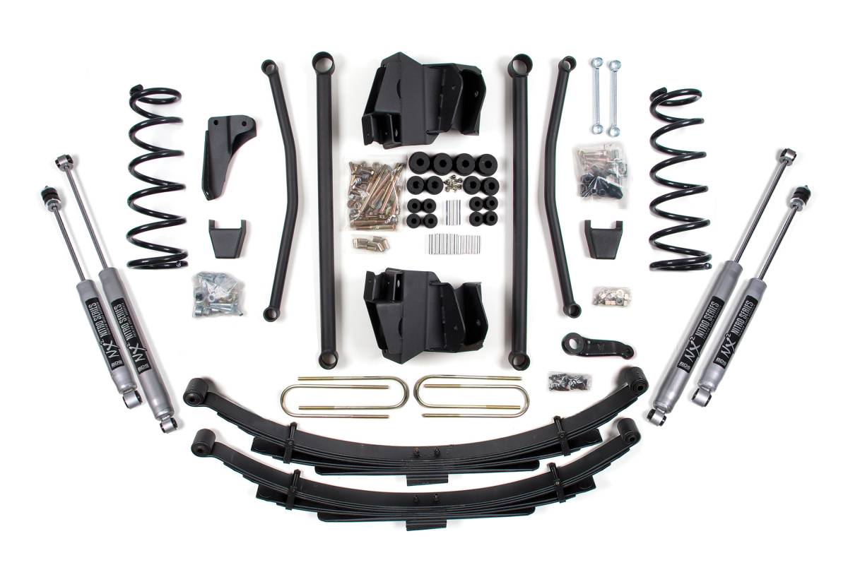 Up front, the kit includes gas-specific Pro-Ride coil springs, all four control arms plus mounting bracket, a forged drop pitman arm and track bar bracket for steering correction, bump stops, sway bar links, and precision-tuned shocks. In the rear, the kit utilizes heavy duty components and a matching set of shocks. Rear lift options include a block kit or leaf springs, and rear axle sizing is available for 3-1/2 inch or 4 inch diameter axles.