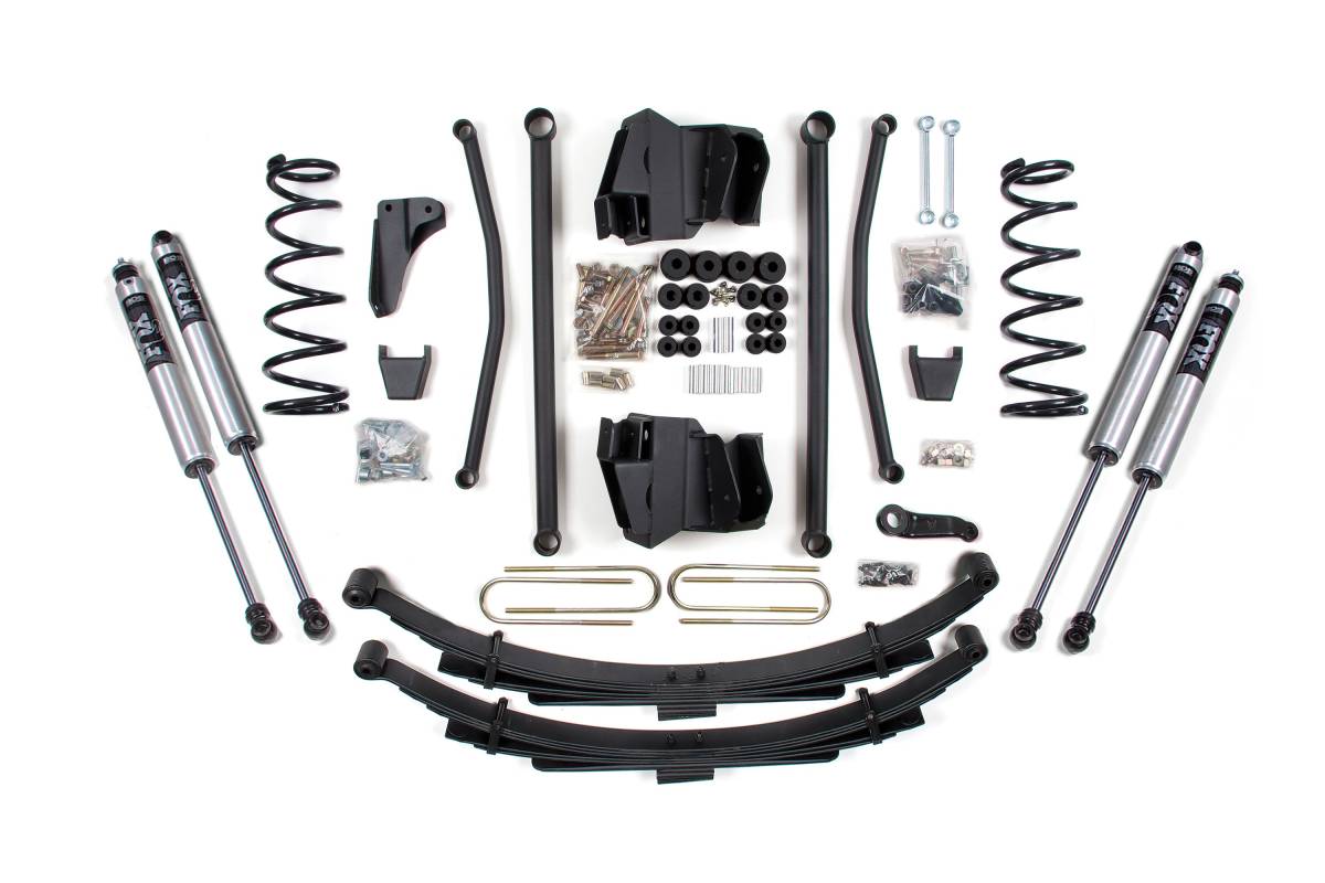 Rear lift via Leaf Springs — multi-leaf progressive design for a smooth ride, maintains factory payload weight ratings. Sized for a 4 inch diameter rear axle. Shocks: FOX 2.0 Performance Series — 2-inch impact extruded aluminum body IFP monotube, CNC machined 6061-T6 aluminum mounting ends, massive 5/8-inch hard chrome plated heat-treated alloy steel shaft, race-developed high-flow piston, application-specific valving, clear anodized finish.