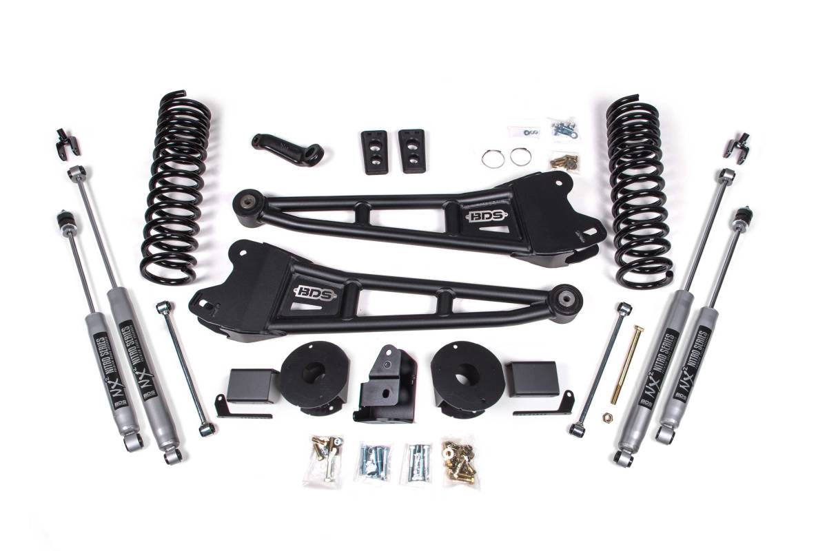 This 4-inch radius arm lift kit from BDS Suspension is designed for 2014–2018 RAM 2500 diesel-powered trucks equipped with factory rear air ride. The kit improves stance, performance, and capability, providing clearance for up to 35-inch tires. Up front, the kit includes diesel-specific Pro-Ride coil springs, heavy-duty tubular radius arms, a forged drop pitman arm, a track bar bracket for steering correction, sway bar relocation hardware, and brake line brackets. In the rear, the kit utilizes heavy-duty air bag spacers, a track bar relocation bracket, bump stop extensions, sway bar links, and a matched set of shocks. New air ride leveling sensor brackets are also included to re-position the ride height sensors, allowing the system to perform at factory ride height and maintain full air bag range of motion.