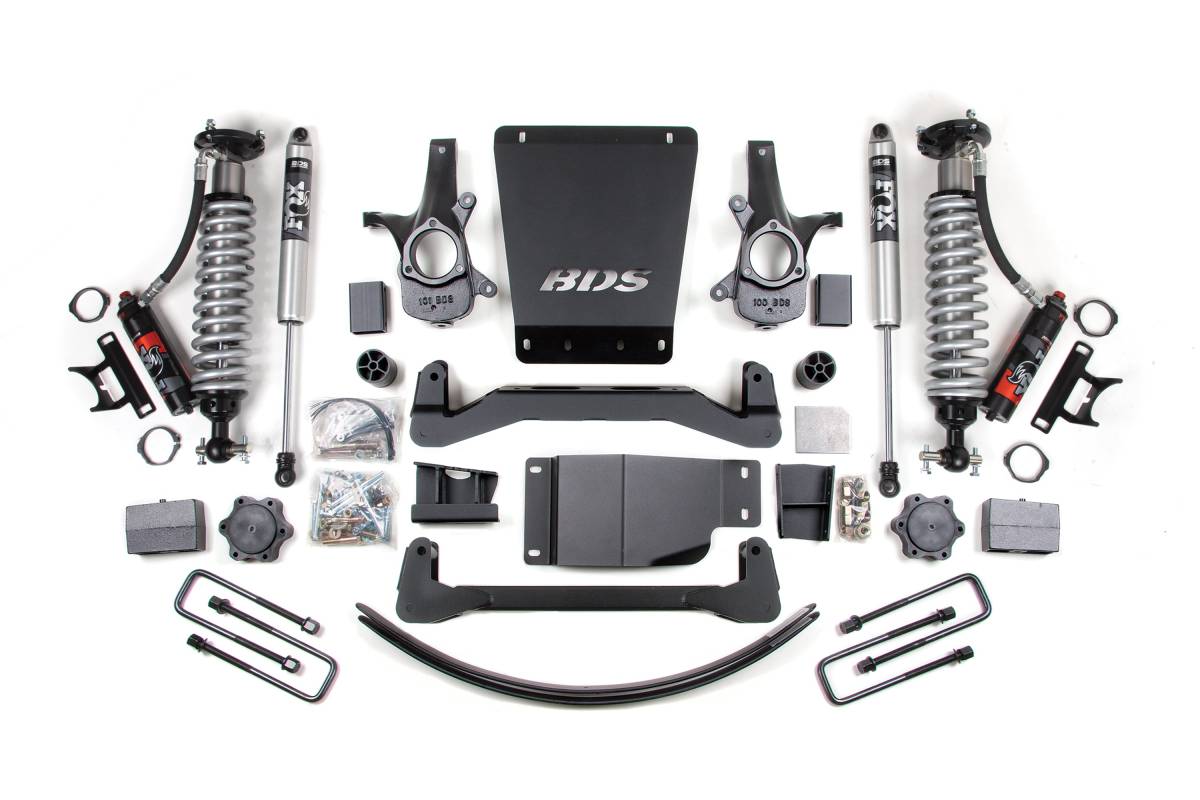 This BDS 6-inch lift kit is engineered for 2007–2013 Chevy Silverado and GMC Sierra 1500 4WD trucks, providing improved stance, ground clearance, and off-road capability with fitment for up to 35-inch tires. Up front, the kit uses full-length replacement strut shocks, high-arched 1/4-inch-thick steel crossmembers, multipiece differential relocation brackets, and heavy-duty skid plates. Steering geometry is corrected at the new ride height with CNC-machined ductile iron steering knuckles that work with factory tie rod ends to maintain steering angles and ESC system compatibility. Sway bar drops, bump stop extensions, brake line brackets, and CV spacers are included for a comprehensive front suspension lift. In the rear, the kit is available with either a lift block and add-a-leaf configuration or full Glide-Ride replacement leaf springs, paired with your choice of FOX rear shocks. A Factory Protection Plus drivetrain warranty is included.
