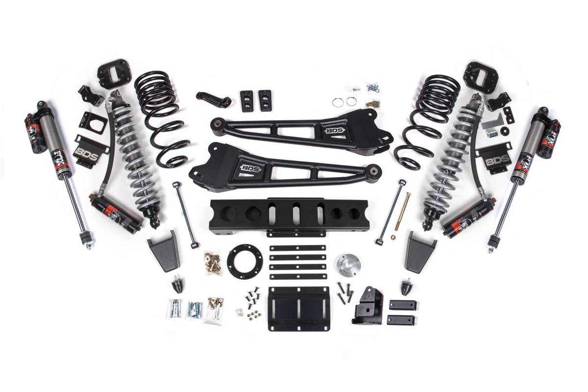 The BDS 6-inch 4-Link Lift Kit for 2013–2018 Ram 3500 4WD Diesel trucks replaces the factory suspension setup with heavy-duty components engineered for strength and performance. Heavy-duty BDS 4-Link arms improve articulation and durability, while the front coilover conversion kit — featuring FOX 2.5 Performance Elite coilovers — delivers precise damping and improved ride quality on and off the road. FOX 2.5 Performance Elite shocks are fitted at the rear to maintain control across varied terrain. An optional FOX 2.0 Hydraulic Bump Stop is available for the front to provide additional impact absorption during aggressive off-road use.