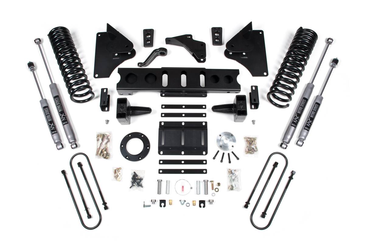 This 6-inch lift kit from BDS Suspension is designed for 2013–2018 RAM 3500 diesel-powered 4WD trucks, providing improved stance, performance, and capability with clearance for up to 37-inch tires. Up front, the kit includes diesel-specific Pro-Ride coil springs, radius arm drop brackets, a forged drop pitman arm, a track bar bracket for steering correction, bump stops, and brake line brackets. In the rear, the kit utilizes a high-strength fabricated lift block (or replacement leaf springs, depending on configuration), longer U-bolts, and a matched set of precision-tuned shocks.