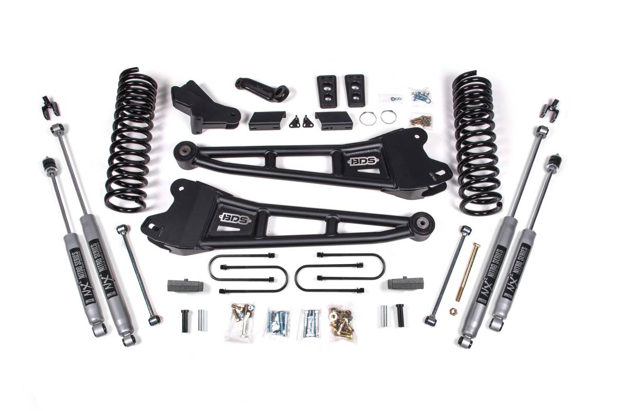 This 4-inch radius arm lift kit from BDS Suspension is designed for 2013–2018 RAM 3500 diesel-powered 4WD trucks. The kit improves stance, performance, and capability while providing clearance for up to 35-inch tires. Up front, it includes diesel-specific Pro-Ride coil springs, heavy duty tubular radius arms, a forged drop pitman arm, a track bar bracket for steering correction, bump stops, and brake line brackets. Out back, the kit uses a high-strength fabricated lift block, longer U-bolts, and a matched set of rear shocks. Shocks are available in NX2 Nitro Series or FOX 2.0 Performance Series configurations.