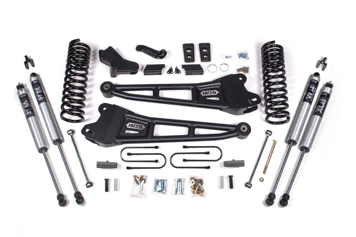 This 4-inch radius arm lift kit from BDS Suspension is designed for 2013–2018 RAM 3500 gas-powered 4WD trucks. The kit improves stance, performance, and capability while providing clearance for up to 35-inch tires. Up front, it includes gas-specific Pro-Ride coil springs, heavy duty tubular radius arms, a forged drop pitman arm, track bar bracket for steering correction, bump stops, and brake line brackets. The rear of the kit utilizes a high-strength fabricated lift block, heavy duty air bag spacer, and longer U-bolts. Precision-tuned shocks are included front and rear.