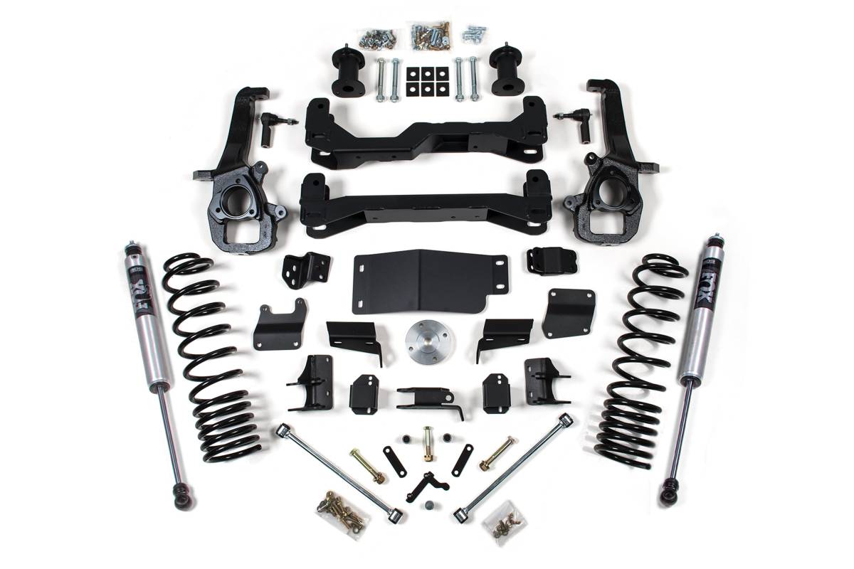 This BDS Suspension 4-inch lift kit is designed for the 2019–2024 Ram 1500 4WD and improves stance, ground clearance, and off-road capability while accommodating up to 35-inch tires. The kit employs a high-clearance design with corrected suspension and steering geometry for maintained on-road handling. Up front, it uses top-mounted strut spacers, high-arched 1/4-inch thick steel crossmembers, a multipiece differential relocation bracket system, heavy-duty skid plates, CNC-machined ductile iron steering knuckles, and replacement tie rod ends for ESC system compatibility. Additional front components include sway bar drops, bump stop extensions, stainless steel braided brake lines, and CV spacers. In the rear, the kit utilizes progressive rate Pro-Ride coil springs, upper control arm relocation brackets for pinion angle correction, a track bar relocation bracket, bump stop extensions, and sway bar links. Rear damping is provided by your choice of NX2 Nitro Series or FOX 2.0 Performance Series shocks.