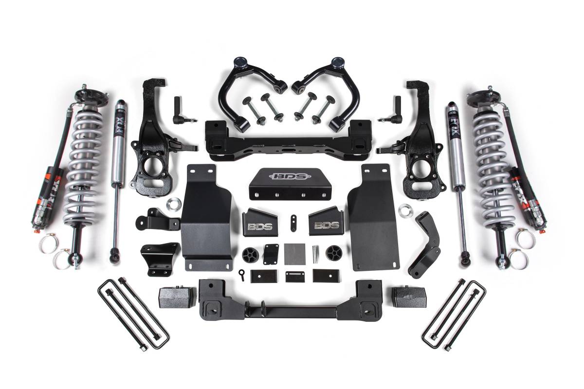 The BDS 4-inch lift kit for 2019–2024 Chevy Silverado and GMC Sierra 1500 4WD Diesel models is built around FOX 2.5 Performance Elite coil-over shocks up front, delivering improved stance, performance, and capability with clearance for up to 33-inch tires. This kit features a high-clearance front suspension design that improves ground clearance, strength, and off-road protection while correcting suspension and steering geometry for proper on-road handling. Up front, the kit uses FOX 2.5 Performance Elite coil-over shocks, high-arched 1/4-inch thick steel crossmembers, a multipiece differential relocation bracket system, heavy duty skid plates, CNC-machined ductile iron steering knuckles, and replacement tie rod ends. Sway bar drops, bump stop extensions, brake line brackets, CV spacers, and all required hardware are also included. In the rear, a heavy duty lift block replaces the stock block to lift and level the stance while retaining ride quality and load capacity, along with new U-bolts and brake line brackets. Rear shock options are available at time of purchase.