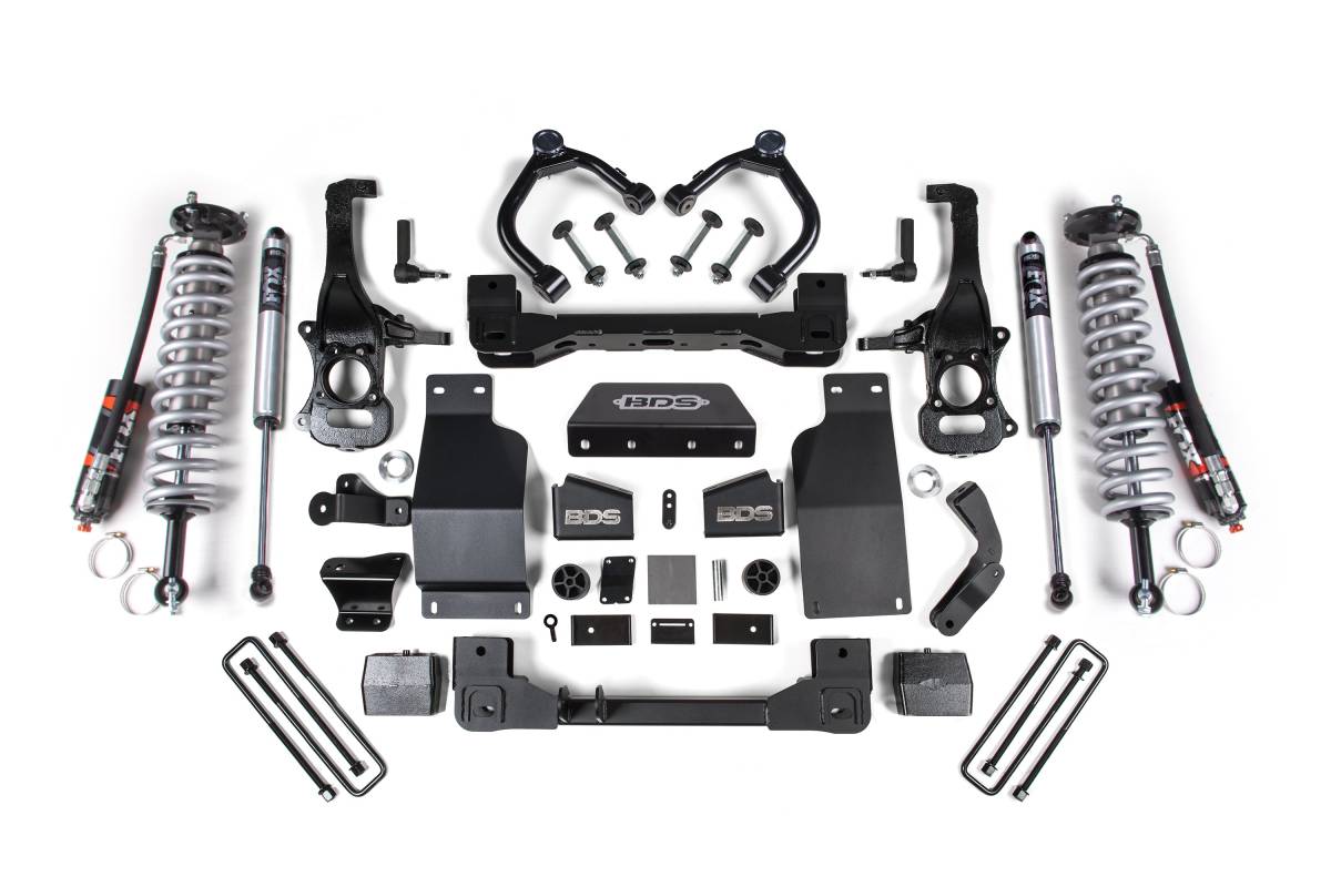 The BDS 6-inch lift kit for the 2019–2026 Chevy Silverado and GMC Sierra 1500 4WD (Diesel) is engineered to improve stance, performance, and off-road capability while providing clearance for up to 35-inch tires. The kit centers on FOX 2.5 Performance Elite coil-over shocks up front, designed specifically as bolt-on units for increased travel and improved terrain absorption without sacrificing on-road comfort. A high-clearance crossmember design, CNC-machined ductile iron steering knuckles, and a comprehensive hardware package address suspension and steering geometry at the new ride height. In the rear, a heavy-duty lift block replaces the factory block to lift and level the stance while retaining ride quality and load capacity, complemented by new U-bolts and brake line brackets.
