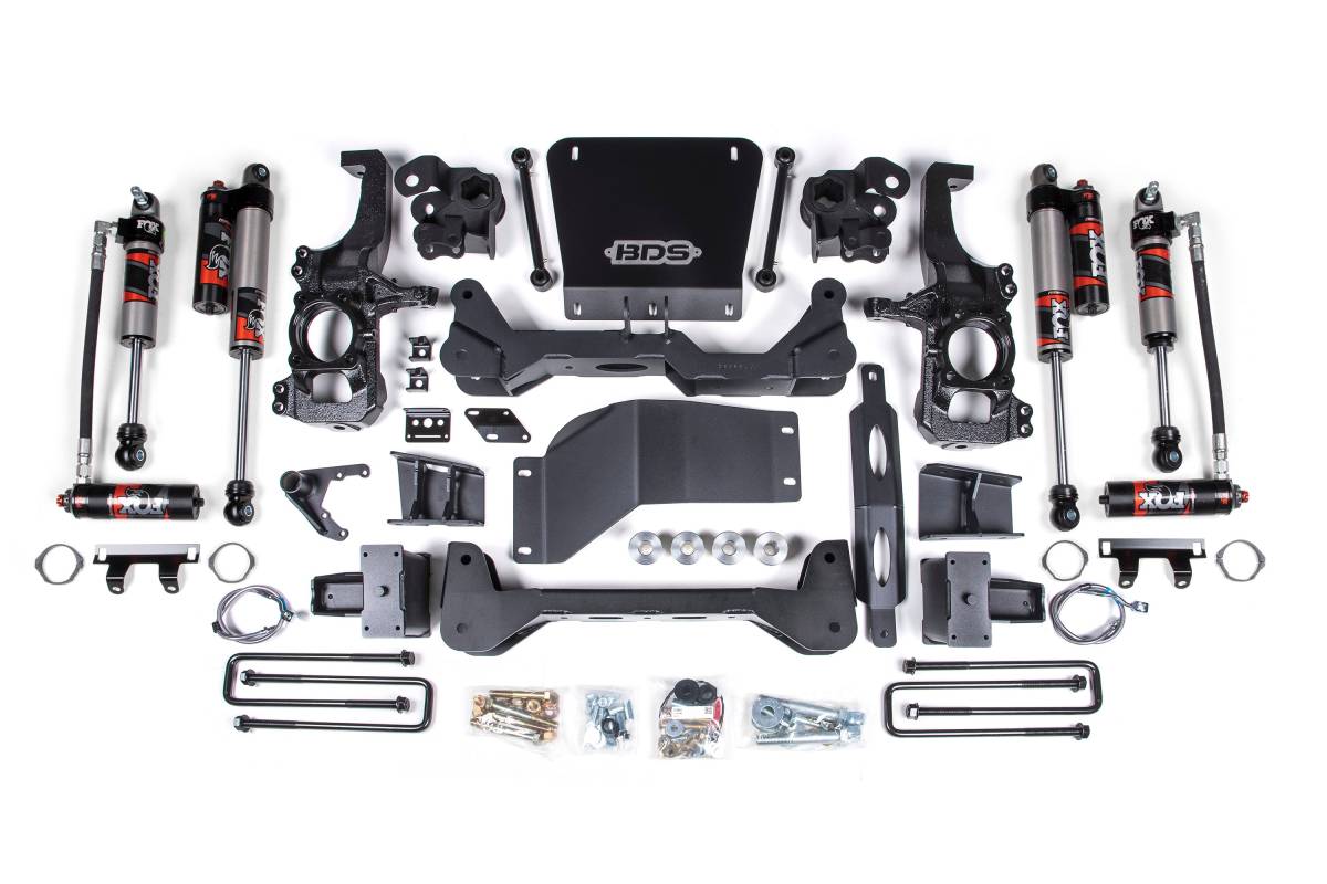 Up front, the kit includes torsion bar relocation brackets, high-arched 1/4-inch thick steel crossmembers, multipiece differential relocation brackets, heavy-duty skid plates, CNC-machined ductile iron steering knuckles, sway bar drops, stainless steel brake lines, and all required hardware. In the rear, replacement lift blocks and u-bolts level the stance while retaining ride quality and load capacity. Brake line and ABS line relocation brackets allow the use of factory brake lines. This kit is configured with FOX 2.5 Performance Elite shocks, which feature a remote reservoir, a black anodized aluminum reservoir for increased cooling efficiency, and a DSC adjuster offering 10 separate low-speed and 12 high-speed compression levels.