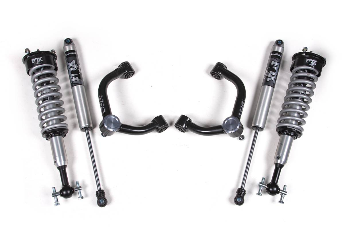 This 2-inch leveling kit for the 2021–2026 Ford F150 4WD combines FOX 2.0 Performance Series coilover shocks with heavy-duty tubular upper control arms to improve stance, ride performance, and capability. The kit includes everything necessary for installation and provides clearance for up to 35-inch tires. FOX 2.0 Performance Series shocks are also included for the rear to provide a matched, balanced ride.
