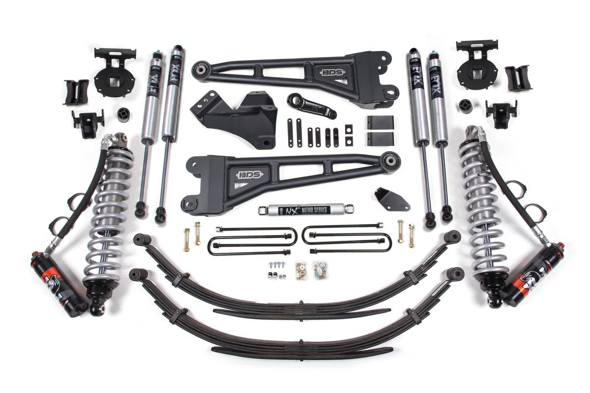 This 4-inch radius arm lift kit with FOX 2.5 Performance Elite coil-over conversion from BDS Suspension is designed for 2005–2007 Ford F250 and F350 Super Duty diesel-powered 4WD trucks. The kit is engineered to improve stance, performance, and off-road capability while providing clearance for up to 35-inch tires. Up front, the kit includes diesel-specific FOX 2.5 coil-over shocks, heavy-duty tubular replacement radius arms, a forged drop pitman arm, a track bar drop bracket for steering correction, sway bar relocation hardware, brake line brackets, and secondary FOX 2.0 shocks. The rear lift is addressed with a high-strength lift block or optional leaf springs, longer U-bolts, and a matching pair of FOX Performance shocks.