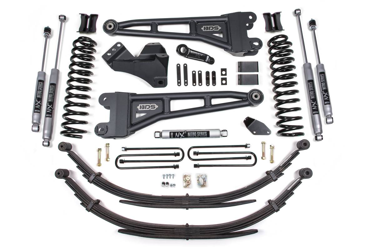 This 4-inch radius arm lift kit from BDS Suspension is designed for 2005–2007 Ford F250 and F350 Super Duty gas trucks. The kit improves stance, performance, and capability while providing clearance for up to 35-inch tires. Up front, the kit includes gas-specific Pro-Ride coil springs, heavy-duty replacement radius arms, a forged drop pitman arm and track bar bracket for steering correction, sway bar relocation, brake line brackets, and precision-tuned nitrogen-charged shocks. In the rear, the kit is available with a steel block lift option or replacement leaf springs, along with brake line brackets and a matching set of shocks. Rear block kits are available in two configurations to accommodate trucks built with or without factory top-mounted overload springs.