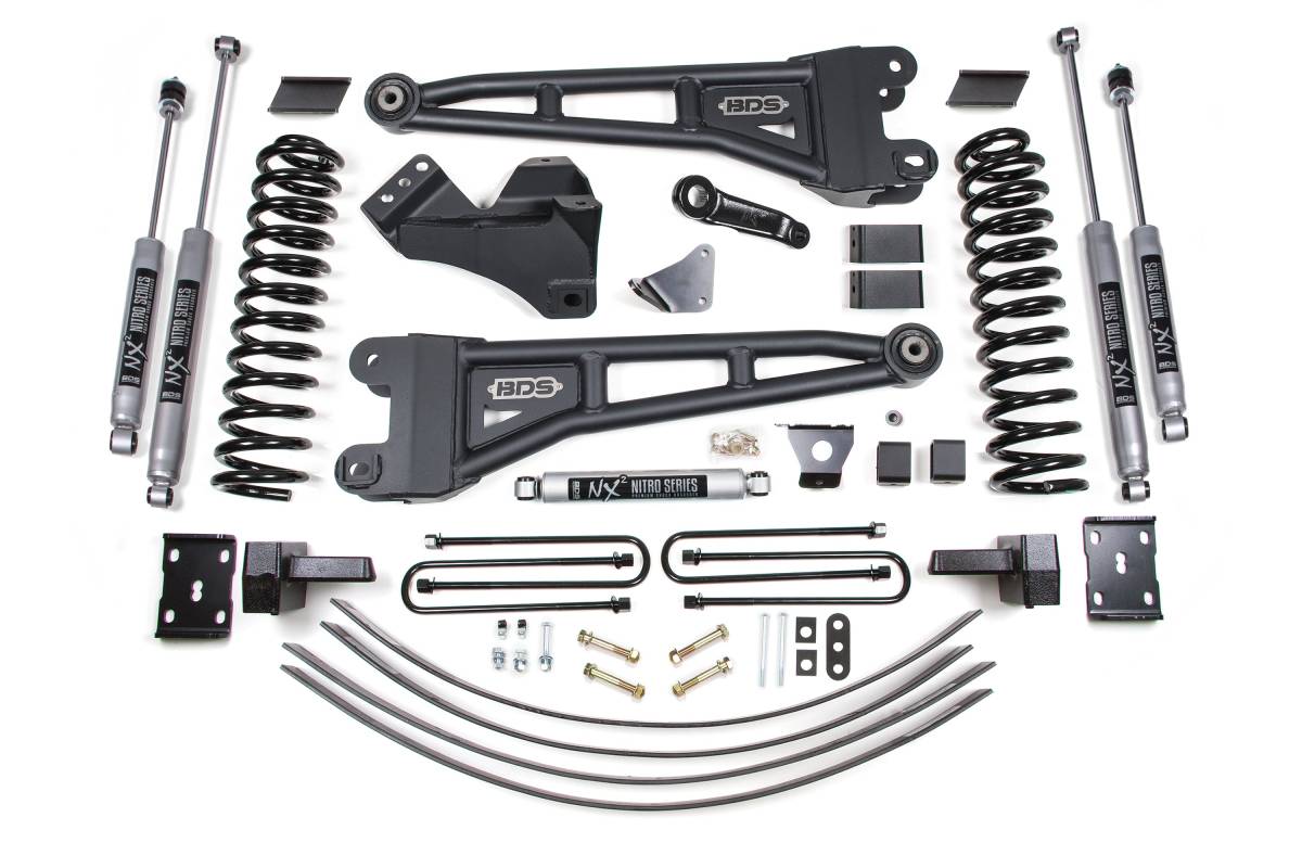 This 6-inch radius arm lift kit from BDS Suspension is designed for 2005–2007 Ford Super Duty F250 and F350 diesel trucks, providing clearance for up to 37-inch tires while improving stance, performance, and off-road capability. Up front, the kit includes diesel-specific 6-inch lift Pro-Ride coil springs, heavy-duty tubular replacement radius arms, a forged drop pitman arm, track bar bracket for steering correction, sway bar relocation hardware, and brake line brackets. The rear kit is available in multiple configurations using high-strength fabricated steel lift blocks with longer U-bolts and brake line brackets, or an upgraded 6-inch rear leaf spring option for a level stance.